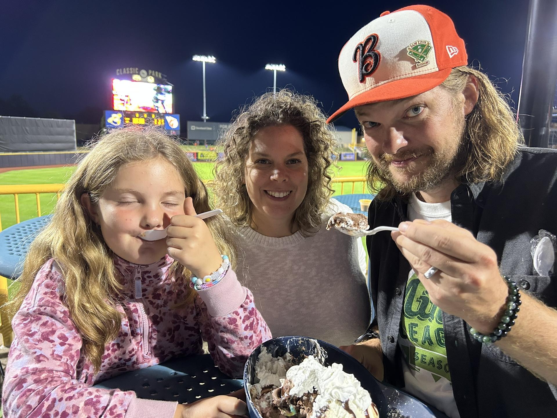Dessert was the last thing on Jae's mind, so I left him in his misery in order to convene with Matt and Carolyn LaWell and their daughter, Margot. I’ve known the LaWells since their 2012 "A Minor League Season" project, when they visited (and wrote about) all 119 full-season ballparks (!) |